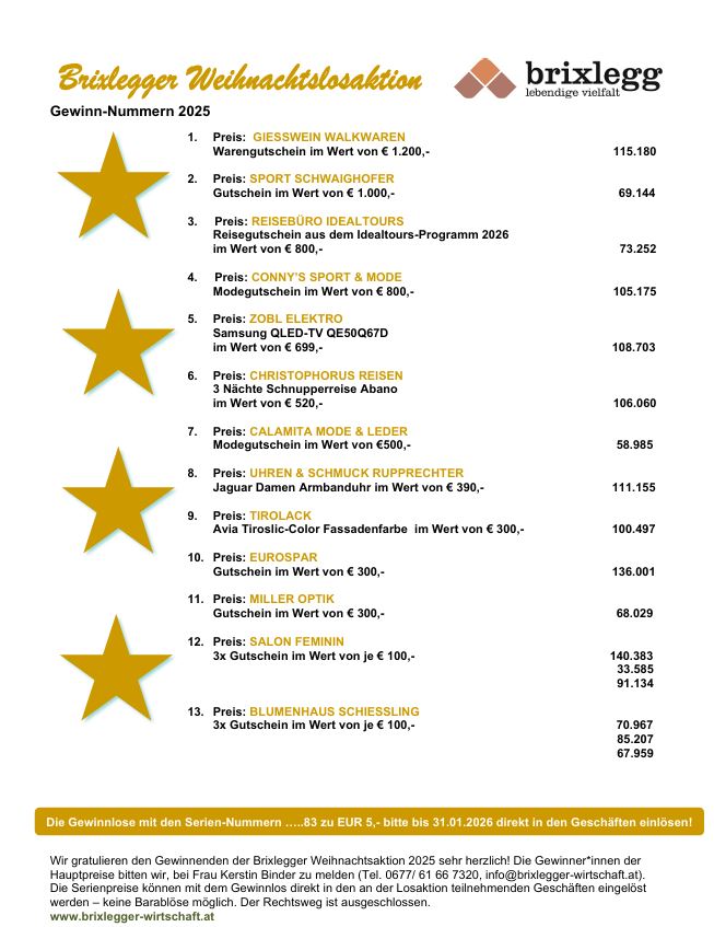 Die EUR 5,- Serienpreise können direkt in den an der Losaktion teilnehmenden Geschäften eingelöst werden - Einlösung bitte bis 31.03.2026. Die Gewinner:innen der Hauptpreise bitten wir, sich bei Frau Kerstin Binder 0677/61 66 7320 oder office@brixlegger-wirtschaft.at zu melden.